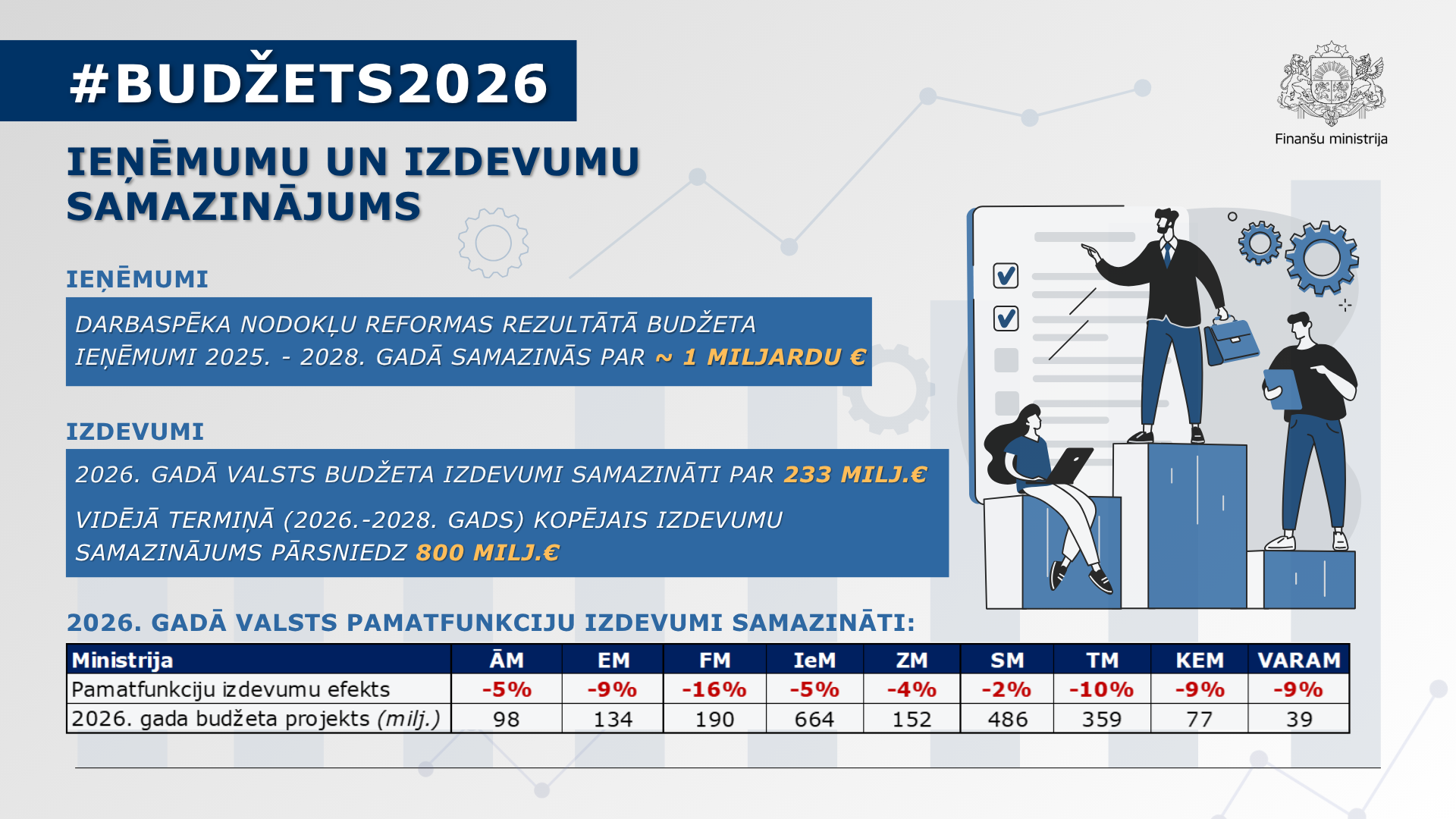 On Tuesday, October 14, the government approved a draft law on the 2026 state budget and the medium-term budget framework for 2026–2028, which was prepared in accordance with European Union (EU) and national fiscal discipline rules. The consolidated state budget revenue for 2026 is planned to be EUR 16.1 billion, while expenditure is planned to be EUR 17.9 billion. The budget for 2026 has been developed with a view to ensuring a more secure future, providing for additional investments in national security, support for families with children and quality education, while maintaining the historically highest level of EU fund investments, as well as an increase in local government revenues of 151.4 million euros, strengthening the resilience of the state and society.