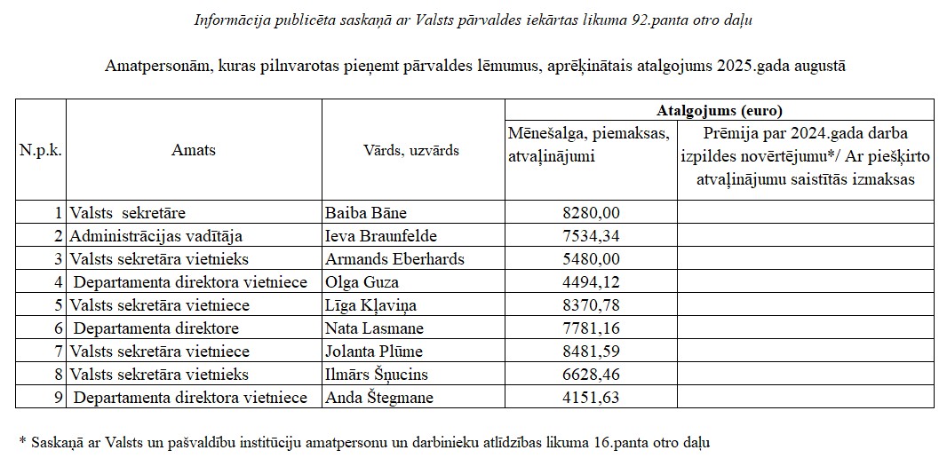 Informācija publicēta saskaņā ar Ministru kabineta 2016. gada 12. aprīļa noteikumiem Nr. 225 "Kārtība, kādā tiek publiskota informācija par amatpersonu (darbinieku) atlīdzības noteikšanas kritērijiem un darba samaksas apmēru sadalījumā pa amatu grupām”.