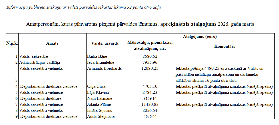 Saskaņā ar Valsts pārvaldes iekārtas likuma 92. panta otro daļu publicējam šādu informāciju: aprēķinātais atalgojums 2026. gada martā amatpersonām, kuras ir pilnvarotas pieņemt vai sagatavot pārvaldes lēmumus.