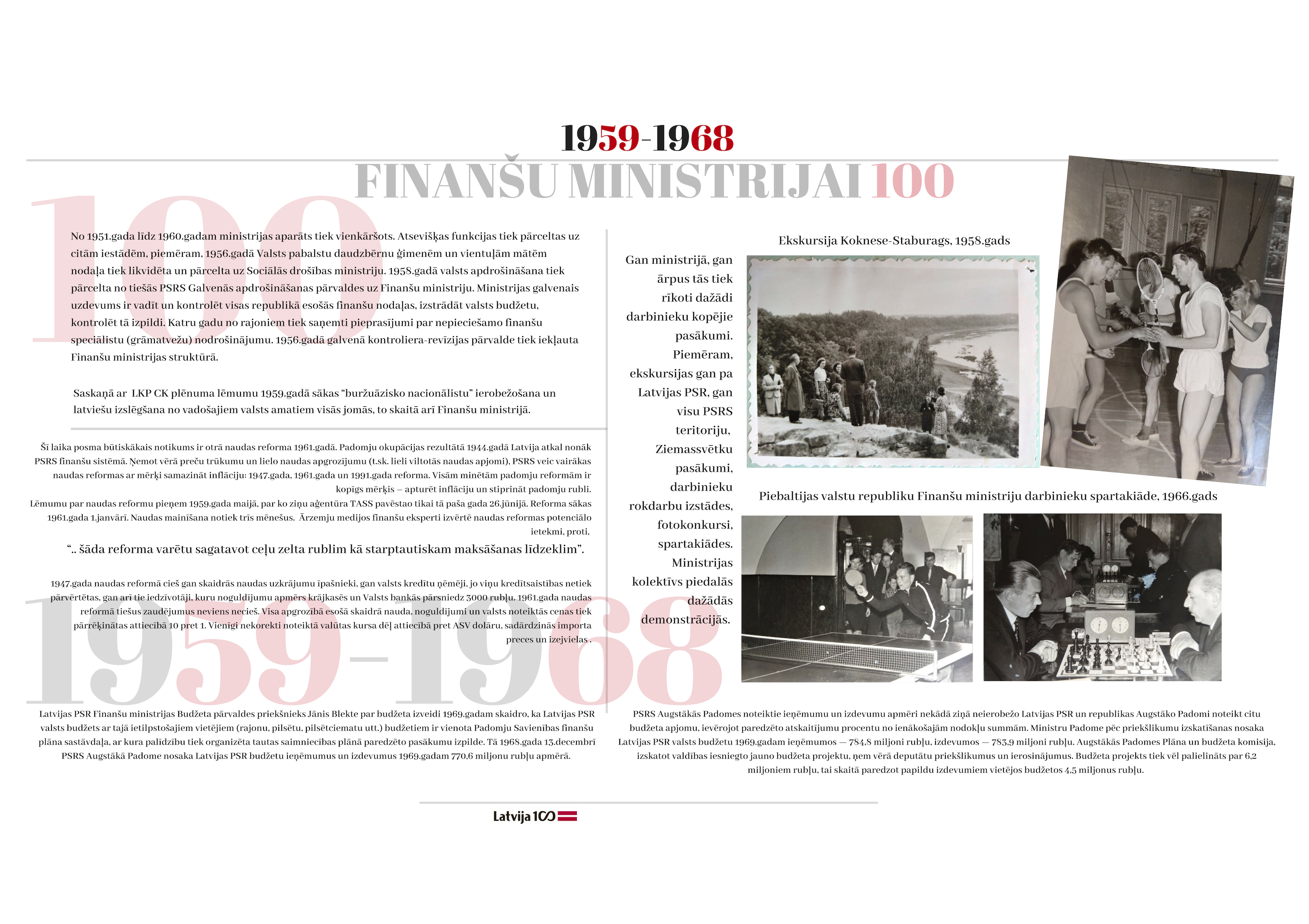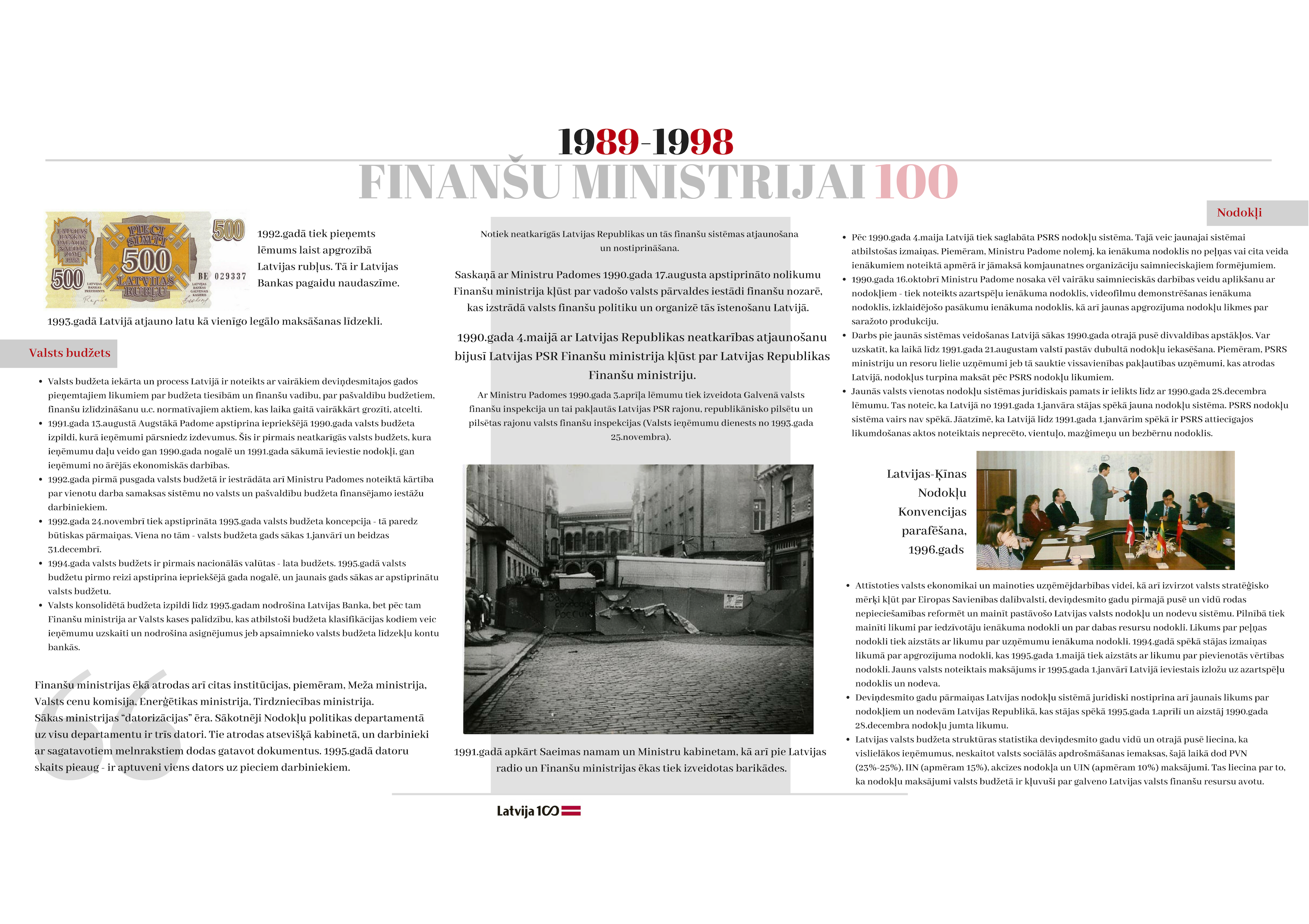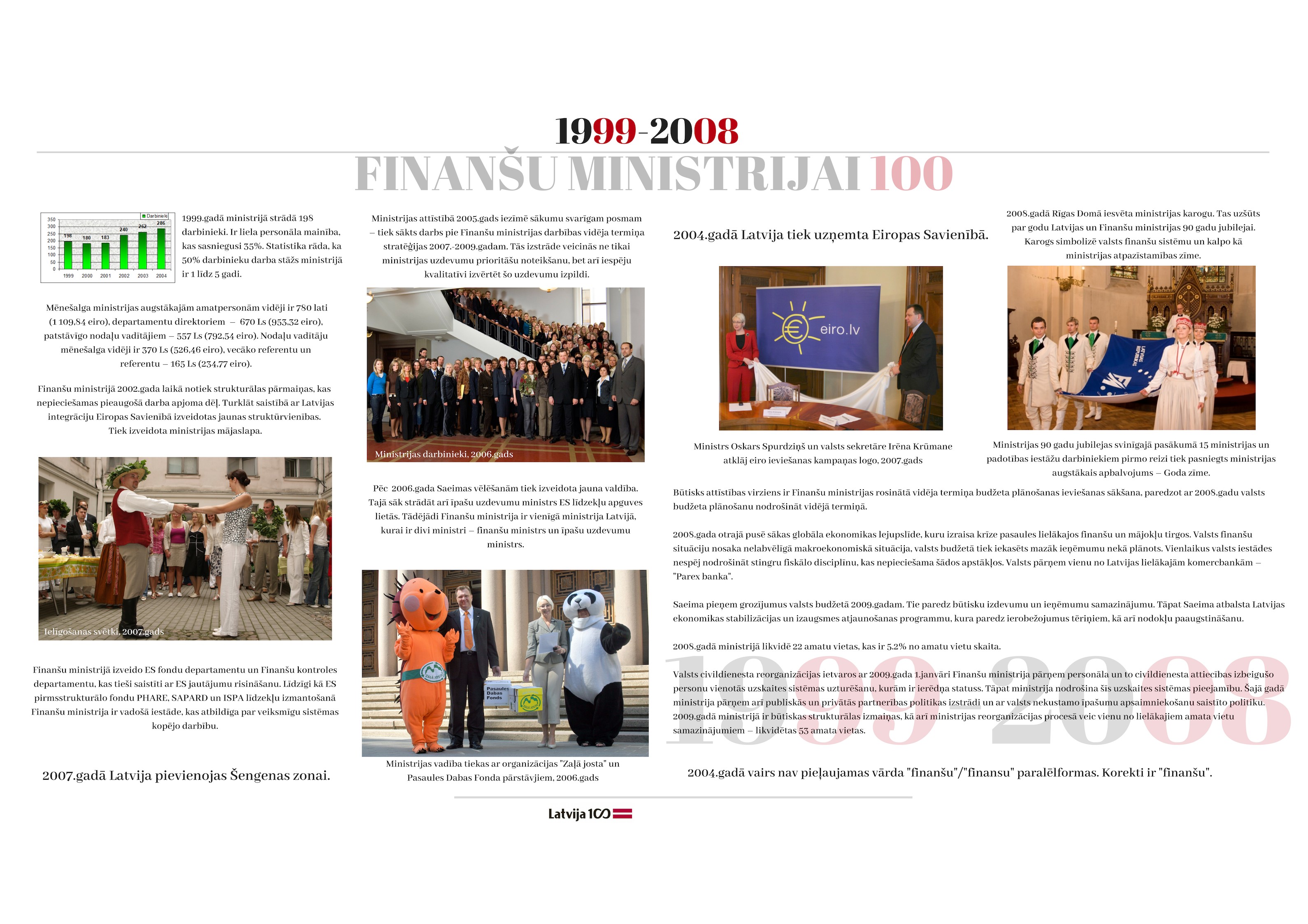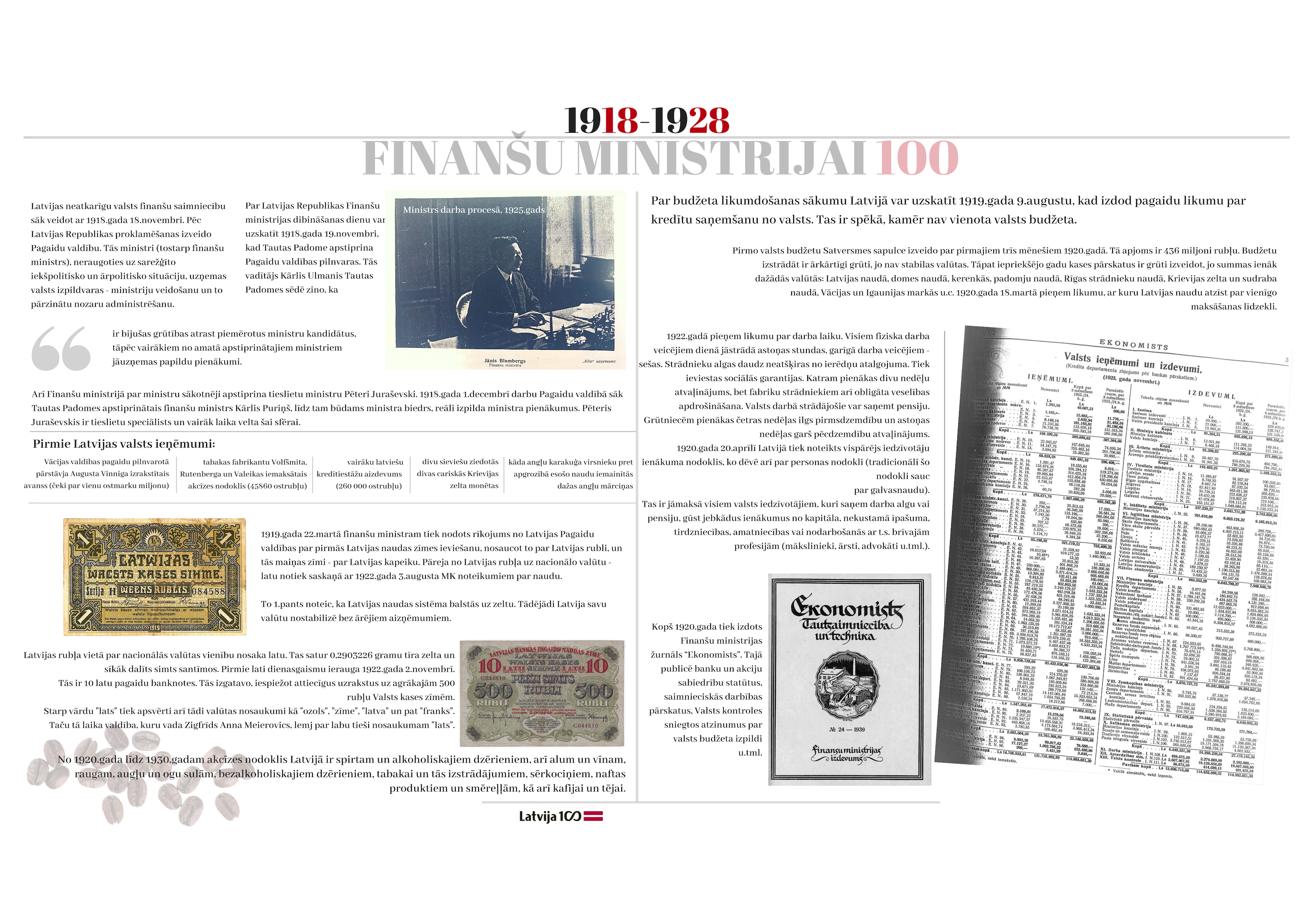 2018. gada 19. novembrī apritēja 100 gadi kopš ministrijas dibināšanas dienas. Gadsimta laikā tā ir piedzīvojusi 47 ministru maiņu, tika uzbūvēta īpaši ministrijas vajadzībām projektēta ēka, piedzīvotas varas maiņas un vairākas nacionālās valūtas. Veiktas neskaitāmas nodokļu politikas izmaiņas. Katra ministrijas desmitgade ietver sevī unikālus notikumus, kas piedzīvoti ne tikai ministrijas darbinieku lokā, bet arī Latvijas valsts mērogā.