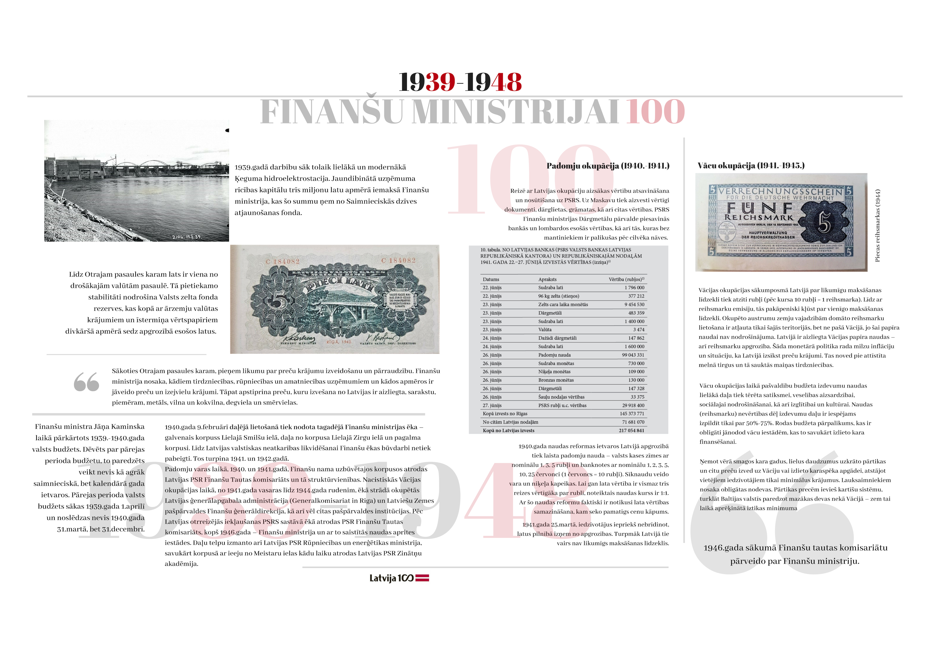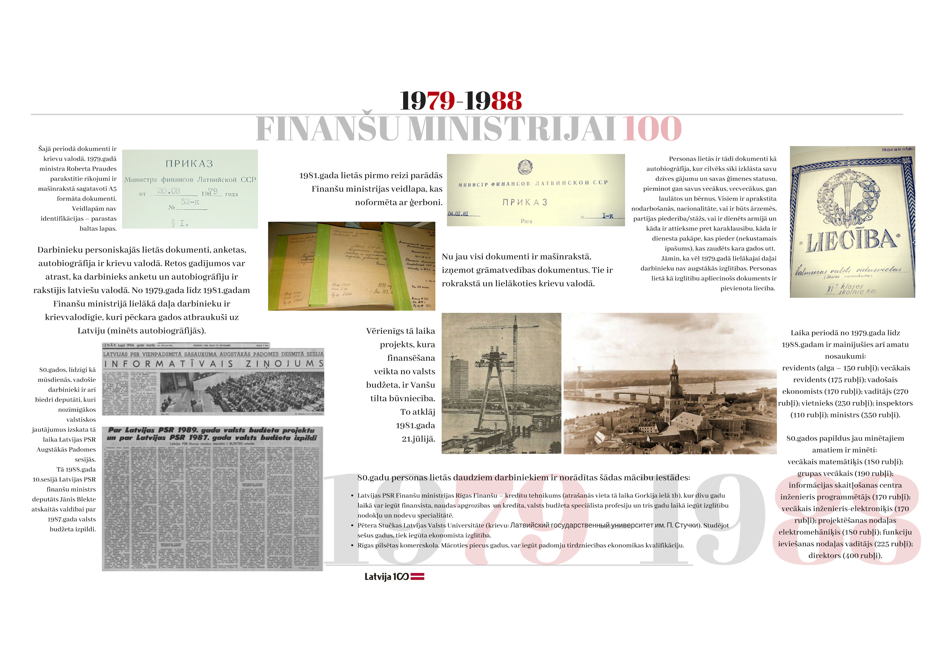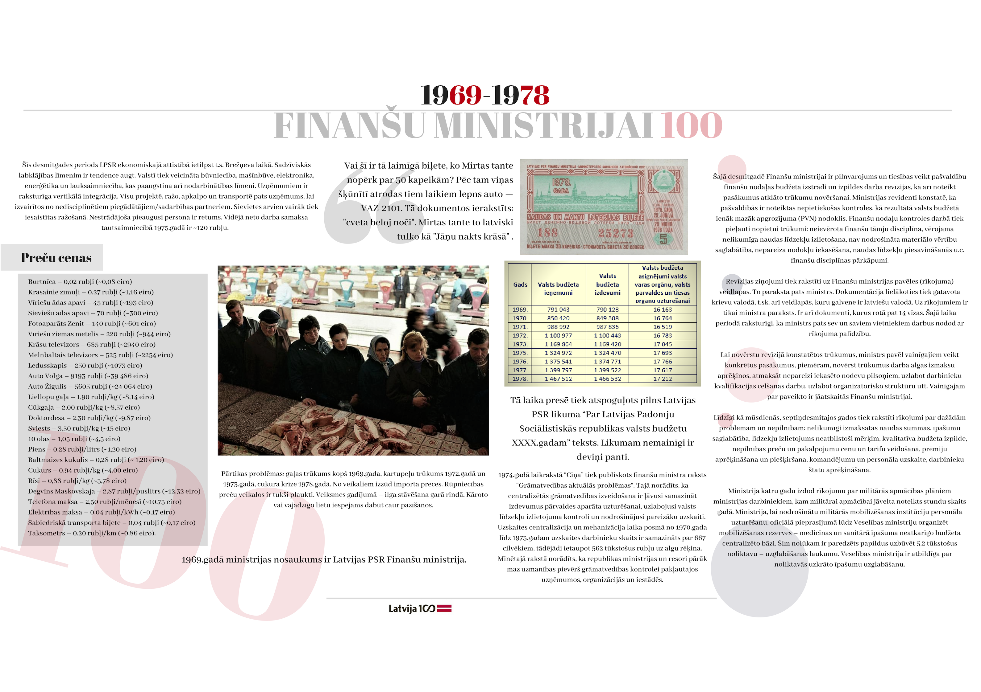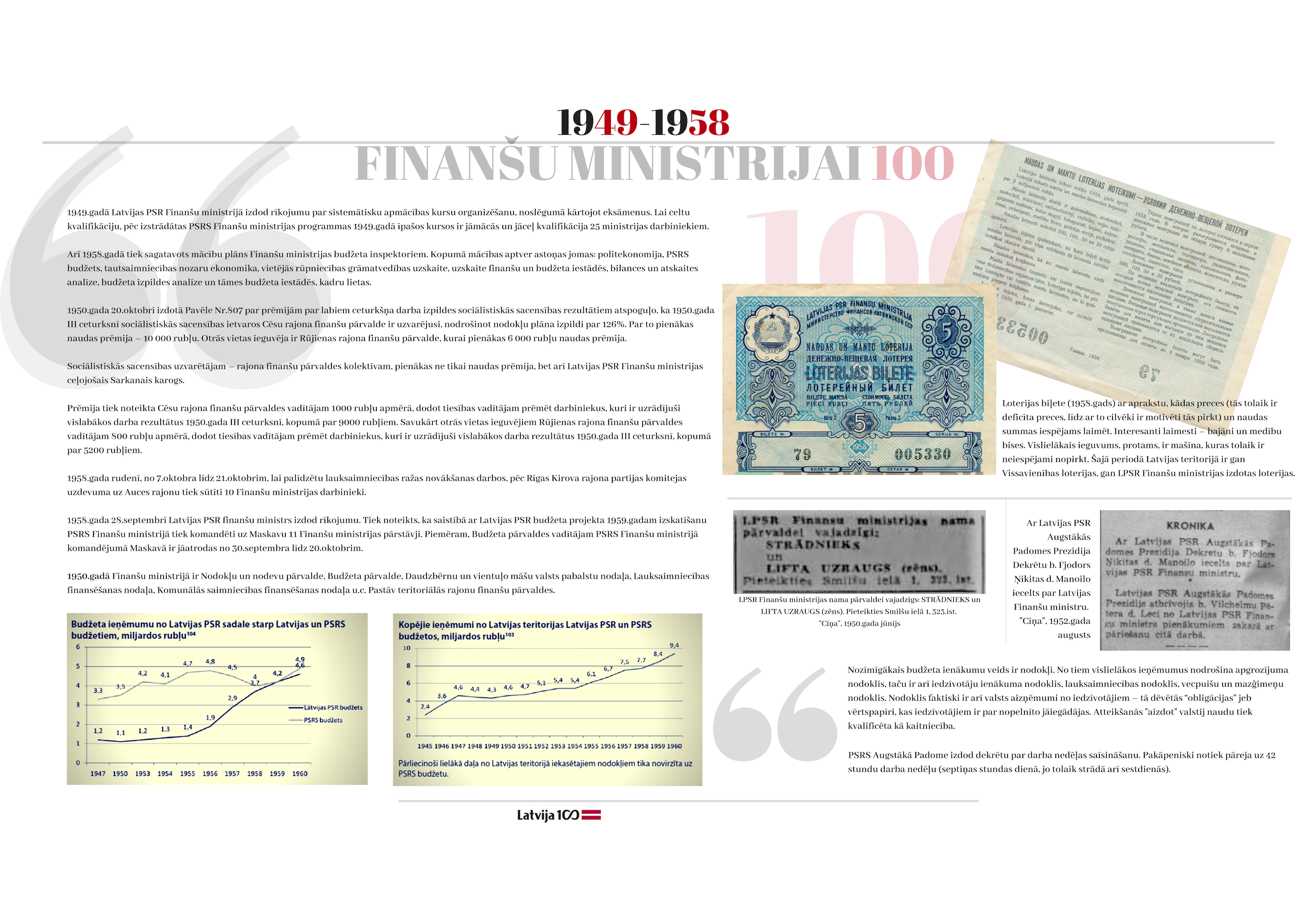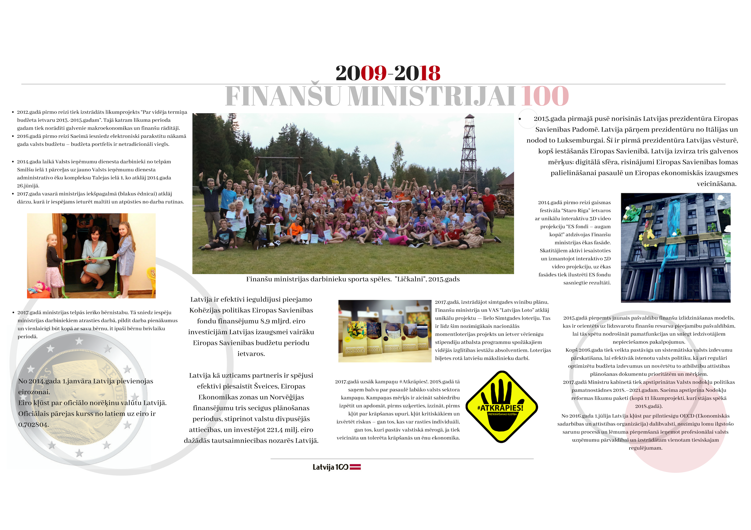 2018. gada 19. novembrī apritēja 100 gadi kopš ministrijas dibināšanas dienas. Gadsimta laikā tā ir piedzīvojusi 47 ministru maiņu, tika uzbūvēta īpaši ministrijas vajadzībām projektēta ēka, piedzīvotas varas maiņas un vairākas nacionālās valūtas. Veiktas neskaitāmas nodokļu politikas izmaiņas. Katra ministrijas desmitgade ietver sevī unikālus notikumus, kas piedzīvoti ne tikai ministrijas darbinieku lokā, bet arī Latvijas valsts mērogā.