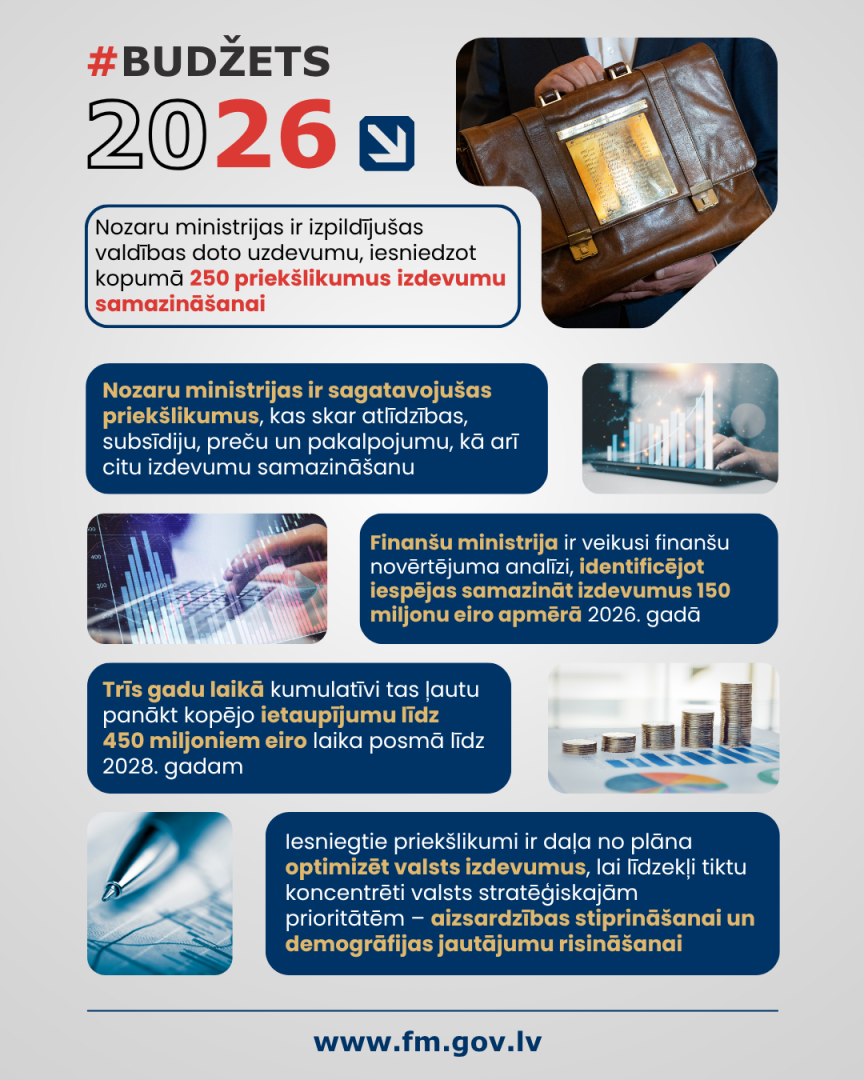 Nozaru ministrijas ir sagatavojušas priekšlikumus, kas skar atlīdzības, subsīdiju, preču un pakalpojumu, kā arī citu izdevumu samazināšanu. Finanšu ministrija (FM) turpinās rūpīgi analizēt un izvērtēt iesniegtos priekšlikumus, lai sagatavotu tos iesniegšanai valdībā. FM ir veikusi arī finanšu novērtējuma analīzi, identificējot iespējas samazināt izdevumus 150 miljonu eiro apmērā 2026. gadā, kas trīs gadu laikā ļautu kumulatīvi panākt kopējo ietaupījumu līdz 450 miljoniem eiro laika posmā līdz 2028. gadam.