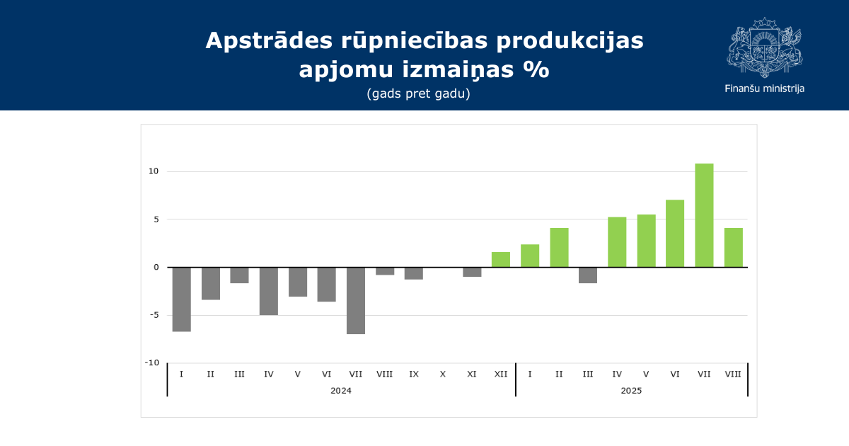Apstrādes rūpniecības apjomi šā gada augustā pieauguši par 4,1% pret pērnā gada augustu, liecina jaunākie Centrālās statistikas pārvaldes dati, tomēr salīdzinot ar iepriekšējo mēnesi, apjomi nedaudz sarukuši. Apjomu pieaugumu turpina pozitīvi ietekmēt pasūtījumu pieaugums gan vietējā, gan eksporta tirgū, ko nosaka arī kopējā Eiropas Savienības apstrādes rūpniecības nozares izaugsme par 1,3% šā gada septiņos mēnešos. Rūpniecība kopumā augustā Latvijā pieaugusi par 2,4%, ko ietekmēja ieguves rūpniecības kritums par 23,9%, kā arī vājais elektroenerģijas un gāzes apgādes apjomu pieaugums par 0,5%.