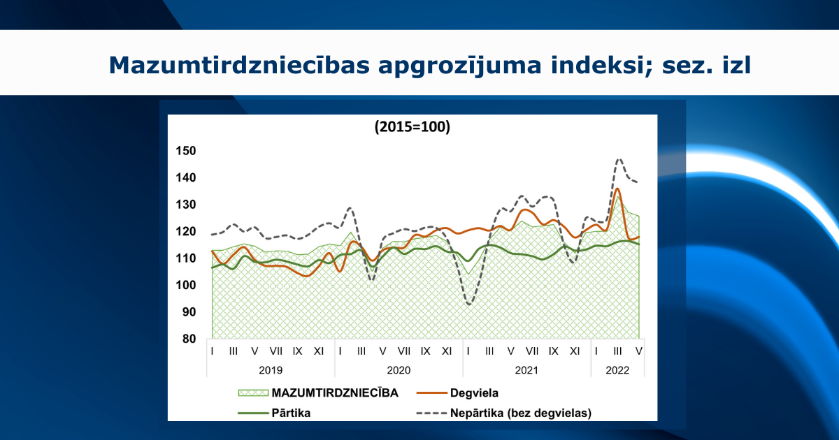 Pārtikas preces kopš šā gada februāra ik mēnesi tiek tirgotas arvien lielākos apjomos salīdzinājumā ar pērnā gada attiecīgajiem mēnešiem, un šā gada maijā pieaugums veido 2,9% pret pērnā gada maiju, kas ir lielākais pieaugums kopš šā gada janvāra. Daļēju ietekmi uz pārtikas patēriņu Latvijā atstāj Ukrainas kara bēgļu pieplūdums.