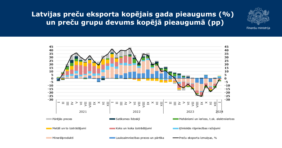 Jaunākie ārējās tirdzniecības dati liecina, ka 2024. gada janvārī Latvijas preču eksporta vērtība veidoja 1640 miljonus eiro, kas bija par 10,0% augstāka salīdzinājumā ar iepriekšējo mēnesi. Tomēr gada griezumā preču eksportā 10. mēnesi pēc kārtas joprojām vērojams neliels kritums, jo salīdzinājumā ar 2023. gada janvāri preču eksporta vērtība samazinājās par 1,1%. Pozitīvi, ka eksporta kritums šā gada sākumā bijis būtiski zemāks nekā iepriekšējos mēnešos. Ja preču eksporta vērtība februārī saglabāsies pašreizējā līmenī, tad sagaidāms, ka nākamajā mēnesī preču eksportam gada griezumā būs neliels kāpums.