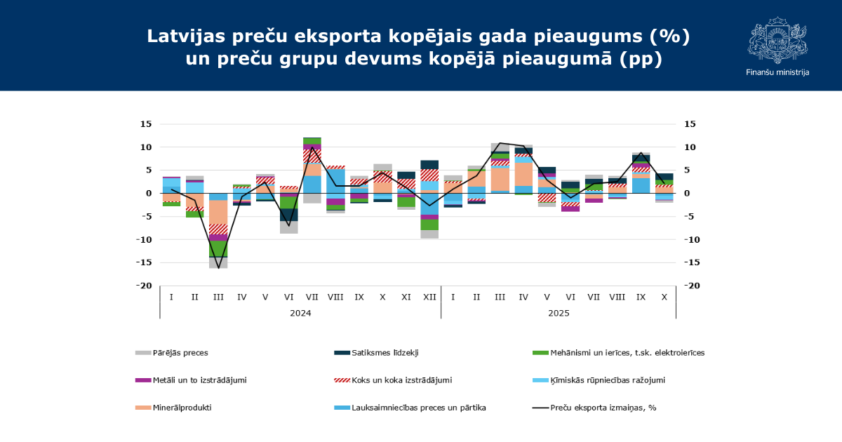 Oktobrī fiksētā eksporta vērtība bija augstākā kopš 2023. gada aprīļa. Visticamāk, ka šā gada novembrī un decembrī eksporta vērtība nedaudz samazināsies salīdzinājumā ar augsto oktobra līmeni, kas ir raksturīgi Latvijas preču eksportam gada nogalē. Tomēr sagaidāms, ka atlikušajos šā gada mēnešos gada griezumā būs fiksēta eksporta izaugsme 2%–3% apmērā.