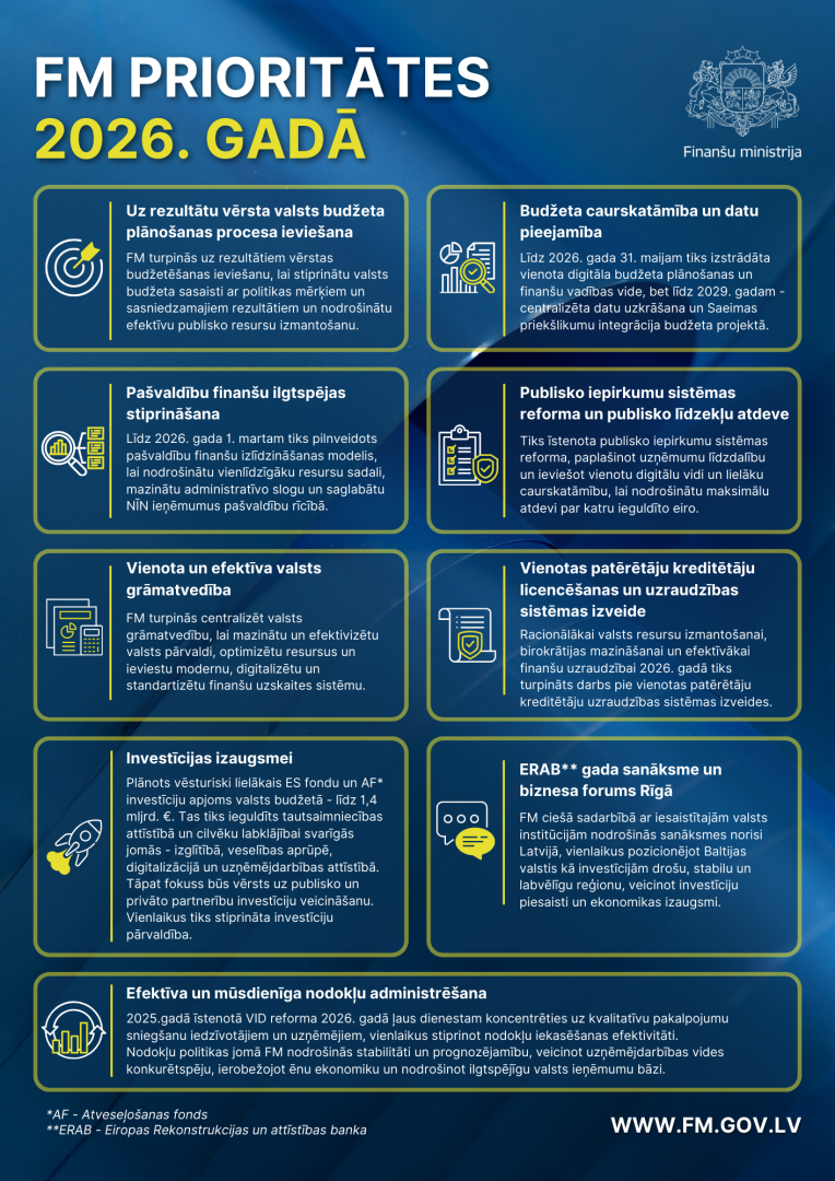 Ar 2026. gadam noteiktajām prioritātēm FM konsekventi turpina valsts finanšu sistēmas modernizāciju, stiprinot publiskās pārvaldes efektivitāti un investīciju vidi, vienlaikus veidojot pamatu Latvijas ekonomiskajai izaugsmei ilgtermiņā.