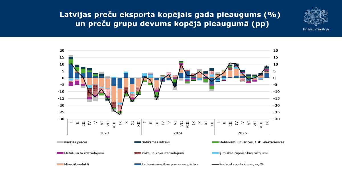 Latvijas preču eksporta pieaugums šā gada septembrī bija diversificēts un fiksēts praktiski visās preču grupās, izņemot papīra un poligrāfijas izstrādājumus, kā arī tekstilmateriālus. Lielāko devumu preču eksporta pieaugumā nodrošināja lauksaimniecības un pārtikas preču eksporta pieaugums par 12,8% jeb 53 milj. eiro, salīdzinot ar pērnā gada septembri. To galvenokārt veicināja eļļas augu sēklu un augļu, piena pārstrādes produktu, graudaugu, labības un miltu, kā arī citu produktu eksports. Šis preču grupas eksports šogad ir samērā svārstīgs, līdz ar to uzturēt tik augstu pieaugumu arī turpmāk būs grūti.