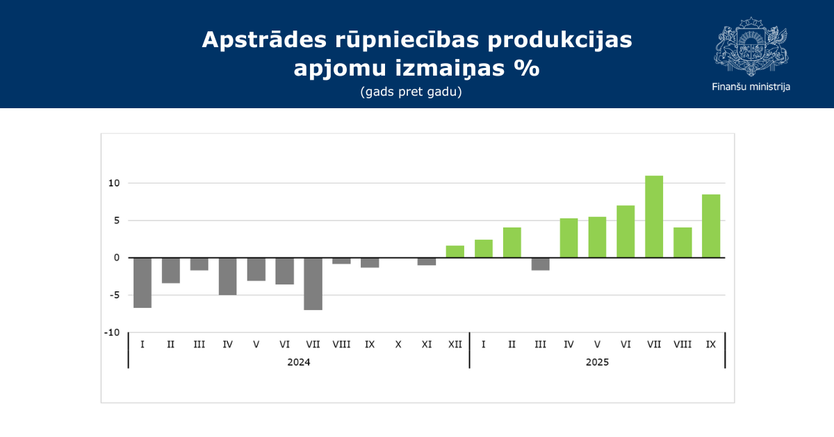 Šā gada septembrī apstrādes rūpniecības apjomi pieauga par 8,5%, salīdzinot ar pērnā gada septembri, liecina jaunākie Centrālās statistikas pārvaldes dati. Nozares izaugsme šā gada deviņu mēnešu laikā ir ievērojama, tādējādi septembrī sasniegti augstākie apjomi kopš 2022. gada jūlija. Septembrī pieaugumu nodrošināja tieši trīs lielākās apstrādes rūpniecības apakšnozares – kokrūpniecība, pārtikas produktu ražošana un metālizstrādājumu ražošana. Tikmēr kopējās rūpniecības izaugsme septembrī bijusi par 2 procentpunktiem zemāka (6,5%), ko noteica 28,1% samazinājums ieguves rūpniecībā nelabvēlīgo laikapstākļu ietekmē un 0,6% sarukums elektroenerģijas un gāzes apgādē.