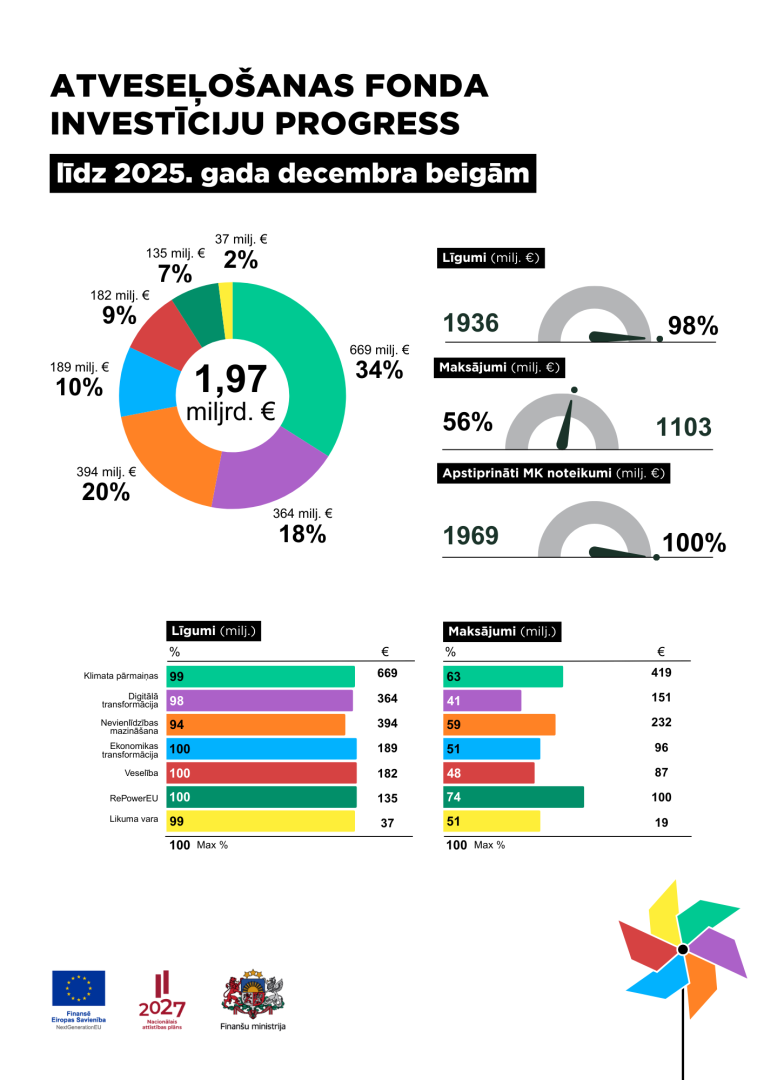 AF plāna ieviešana notiek ne vēlāk kā līdz 2026. gada septembrim, lai Latvija no EK saņemtu visu pieejamo 1,97 miljardu eiro piešķīrumu par reformu un investīciju īstenošanu. Līdz šim no EK saņemts vairāk nekā 1 miljards eiro jeb 55% no kopējā piešķīruma, tai skaitā par jau izpildītiem un ikgadējos maksājumu pieprasījumos iekļautajiem AF plāna rādītājiem. Līdz ar ceturtā EK maksājuma saņemšanu, kas indikatīvi paredzēts 2026. gada pirmajā pusē, Latvija būs kopā saņēmusi 1,47 miljardus eiro.