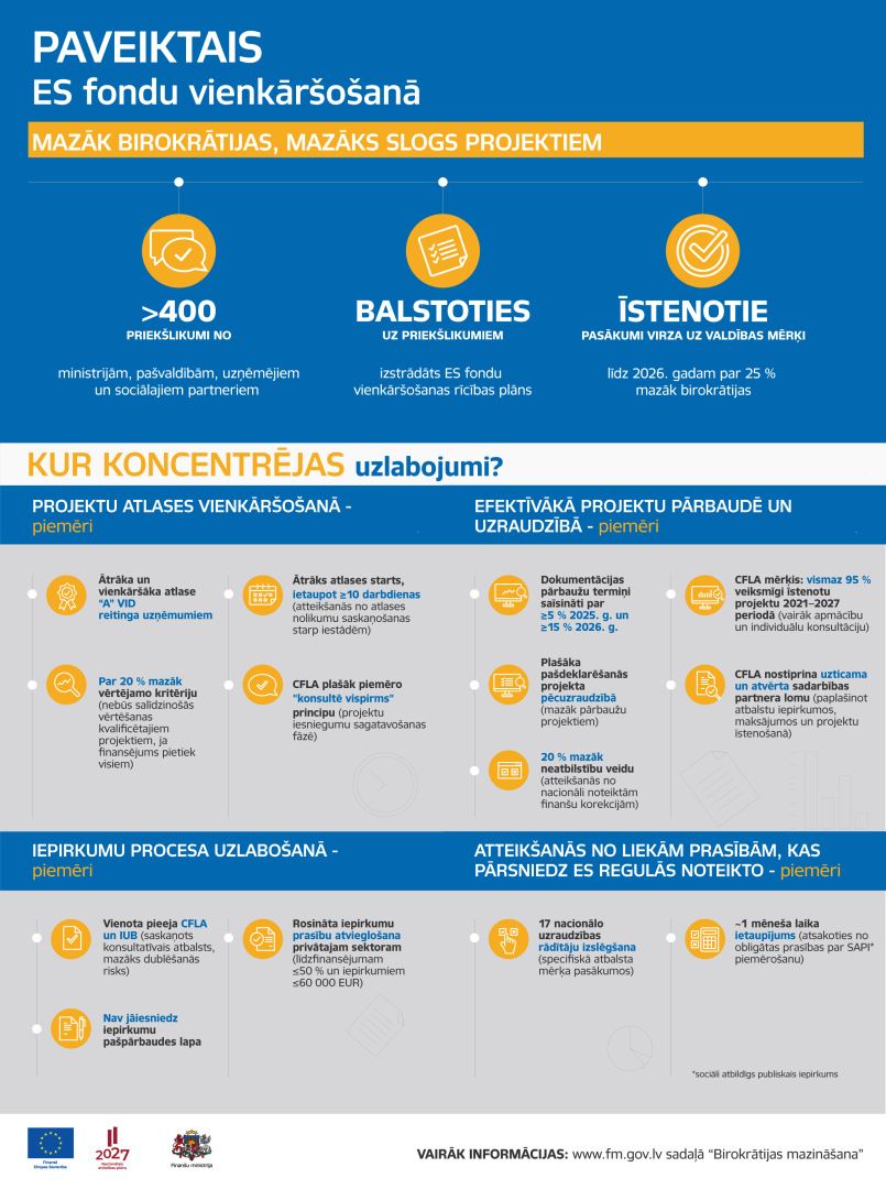 Finanšu ministrija (FM) kā politikas veidotāja Eiropas Savienības (ES) fondu investīciju ieviešanā sadarbībā ar Centrālo finanšu un līgumu aģentūru (CFLA) un nozaru ministrijām kopš šī gada pavasara īstenojusi jaunus pasākumus administratīvā sloga mazināšanai ES fondu projektos. Šobrīd ieviesti praktiski visi ieplānotie vienkāršošanas pasākumi, un tuvākajā laikā tiks iesniegti atlikušie grozījumi Ministru kabineta (MK) noteikumos par pārbaužu veikšanu. Tādējādi ir nodrošināti tūlītēji praktiski ieguvumi projektu īstenotājiem. Stratēģiski svarīgs uzdevums ir vēl vairāk nostiprināt CFLA lomu kā klientorientētam sadarbības partnerim projektu īstenotājiem, lai sekmētu ES fondu projektu rezultatīvu īstenošanu. Vienlaikus FM un CFLA turpina vērtēt arvien jaunas iespējas ES fondu investīciju ieviešanas optimizēšanai, liecina FM informatīvais ziņojums, kas otrdien, 2. septembrī tiks skatīts MK sēdē.