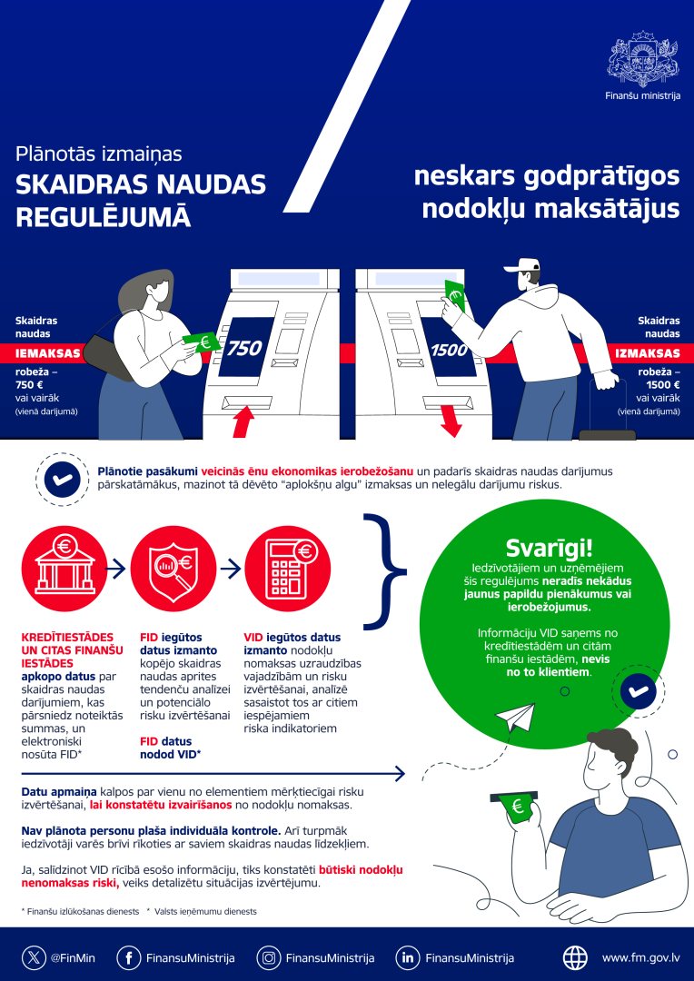 Svarīgi uzsvērt, ka iedzīvotājiem un uzņēmējiem šis regulējums neradīs nekādus jaunus papildu pienākumus vai ierobežojumus, jo arī turpmāk personai būs tiesības brīvi rīkoties ar saviem skaidras naudas līdzekļiem. Tāpat regulējums neradīs nekādas sekas iedzīvotājiem, kuri saņem un deklarē legālus ienākumus.